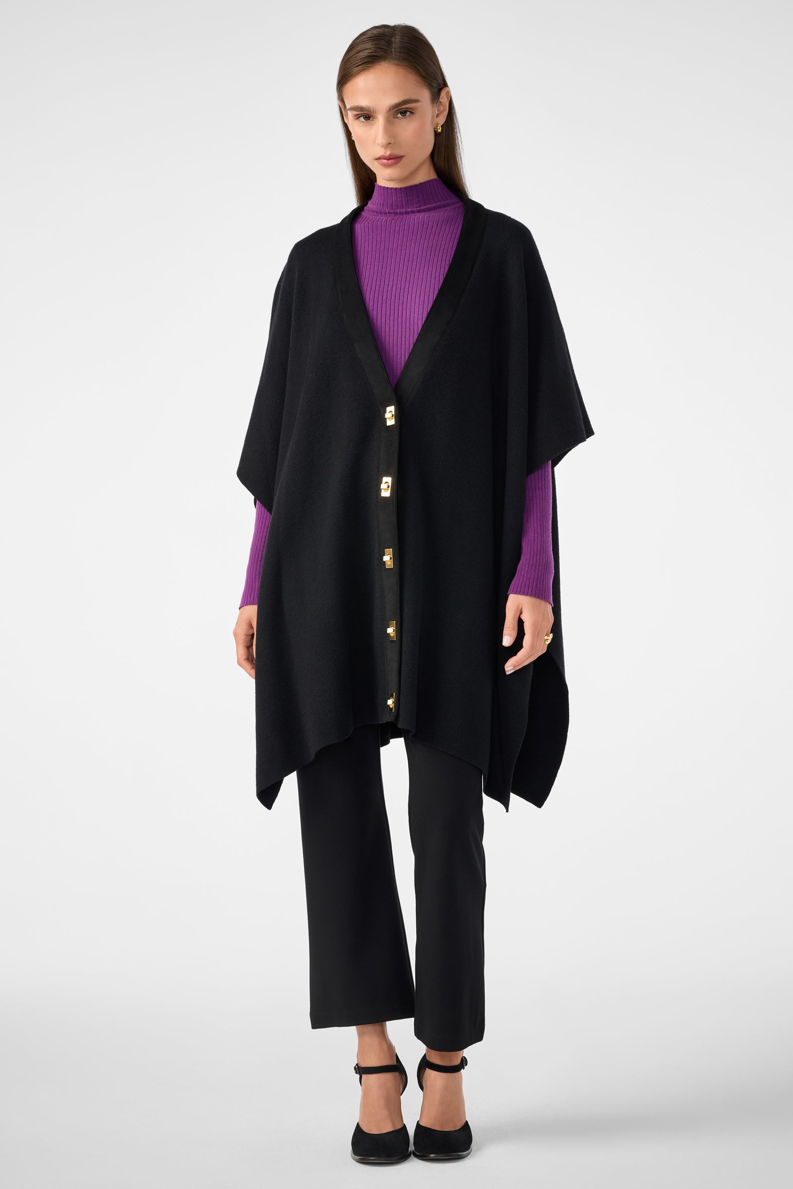 This boxy-fit poncho is a versatile and cozy layer that you’ll mix and match with your wardrobe year-round. It features 3/4 sleeves, a V-neck, center front luggage locks, and a suedette accent around the neckline. This poncho is made of a soft compact sweater knit.