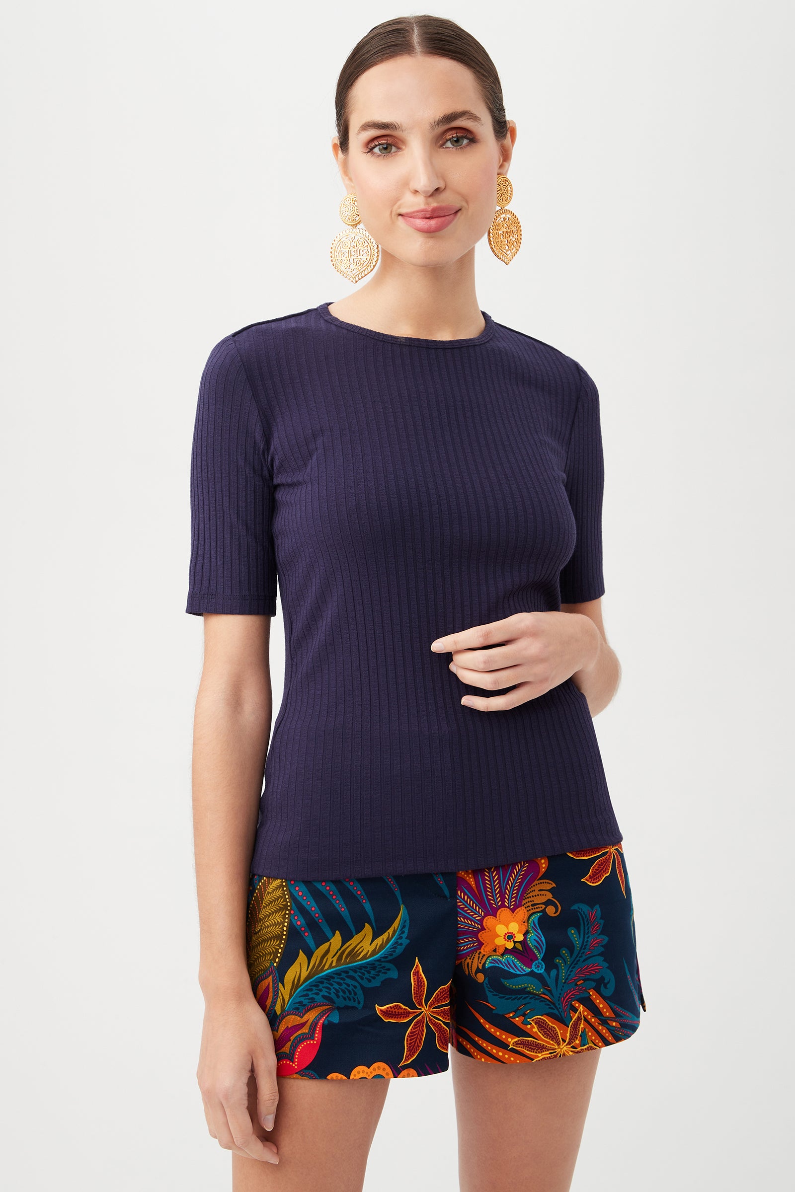 Enjoy the perfect combination of comfort and style with this versatile short-sleeve sweater. Made with soft Italian ribbed knit fabric and featuring a crewneck, short sleeves, and a fitted silhouette, this short-sleeve sweater is sure to become a luxurious wardrobe essential.